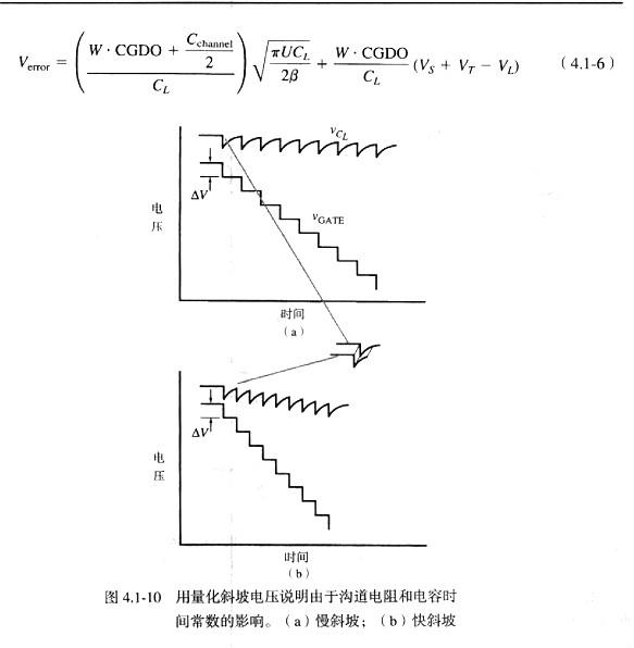 实亿国际 为了对快慢情况有更进一步的了解,将栅极电压模拟为分段恒定波形(一个量化波形)并考虑每个跳变过程中电荷的流动,如图4.1-10所示。图中,所示的CL电压的变化范围表示管子导通时的工作情况。在两种情况中,量化的电压步长是相同的,但是步长间的时间是不同的。CL两端电压是呈指数变化的,其时间常数由沟道电阻和沟道电容决定,并不随快、慢情况而改变。