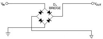 2.其他还可以用二极管桥对输入做整流,这样电路就永久有正确的极性(图2)。这些方案的缺点是,二极管上的压降会消耗能量。输入电流为2A时,图1中的电路功耗为1.4W,图2中电路的功耗为2.8W。