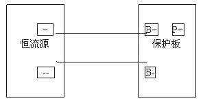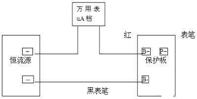 调恒流源为3.7V/500mA;万用表设置为uA档,表笔插入uA接孔,然后与恒流源串联起来接保护板B+、B-如下图所示:此时万用表的读数即为保护板的自耗电,如无读数用镊子或锡线短接B-、P-,激活电路。