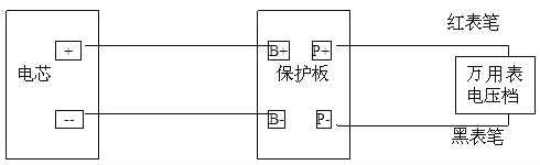 电芯接到保护板B+、B-上,用镊子或锡线短接B-、P-,再短接P+、P-;短路后用万用表测保护板开路电压(如下图所示);反复短接3-5次,此时万用表读数应与电芯一致,保护板应无冒烟、爆裂等现象。