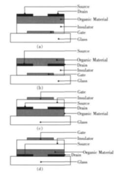 传统的有机场效应晶体管的主要包括底栅和栅两种结构,其中底栅和顶栅结构又分别包括顶接触和底接触两种结构,如图1所示。