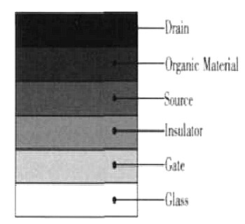 图2是垂直沟道OFET结构,是以缩短沟道长度为目的的一类新型场效应晶体管。它以半导体层为沟道长度,依次蒸镀漏-源-珊电极,通过改变栅电压来控制源、漏电极的电流变化。