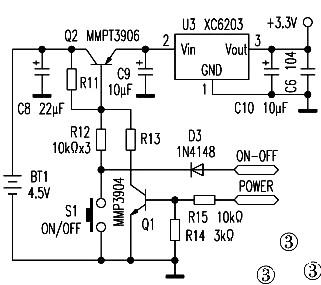2.开机状态:当需求开机时,按下开关S1,使三极管Q2的基极电位被拉低,三极管Q2导通,电源转换芯片输出3.3V给单片机供电。单片机上电后,开端初始化。普通初始化时会将I/O引脚置为高电平,但是初始化需求一定的时间,所以S1按下后不能马上松开。单片机初始化完成后,ON-OFF经过二极管D3被开关S1拉低,单片机检测到其为低电平,阐明开关被按下,确认开机正常运转;同理POWER输出高电平使Q1导通,此时即便开关S1松开,ON-OFF恢复高电平,也不会影响整个系统的工作。至此,电路开机完成。