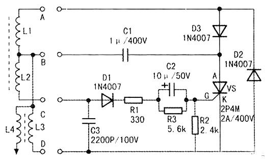 其工作原理是L1产生交流电压经D3整流向C1充电,控制线圈L2电流经D1整流,再经R1、R2、R3限流分压后触发可控硅导通,电流经L3并在L4上产生高压完成点火。
