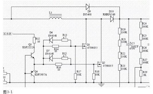 图3-1所示;是三星V2屏等离子开关电源的PFC激励部分。从图中可以看出;这是一个并联开关电源L1是储能电感,D10是这个开关电源的整流二极管,Q1、Q2是开关管,为了保证PFC开关电源有足够的功率输出,采用了两只MOS管Q1、Q2并联应用(图3-2所示;是该并联开关电源等效电路图,图中可以看出该并联开关电源是加在整流桥堆和滤波电容C5之间的),图中Q3、Q4是灌流激励管,Q3、Q4的基极输入开关激励信号, VCC-S-R是Q3、Q4的VCC供电(22.5V)。两只开关管Q1、Q2的栅极分别有各自的充电限流电阻和放电二极管,R16是Q2的在激烈信号为正半周时的对Q2栅极等效电容充电的限流电阻,D7是Q2在激烈信号为负半周时的Q2栅极等效电容放电的放电二极管,同样R14、D6则是Q1的充电限流电阻和放电的放电二极管。R17和R18是Q1和Q2的关机栅极电荷泄放电阻。D9是开机瞬间浪涌电流分流二极管。