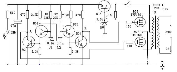 这是一款非常容易制作的逆变器,可以将12V电源电压变为220V市电,电路由BG2和BG3组成的多谐振荡器推动,再通过BG1和BG2驱动,来控制BG6和BG7工作。