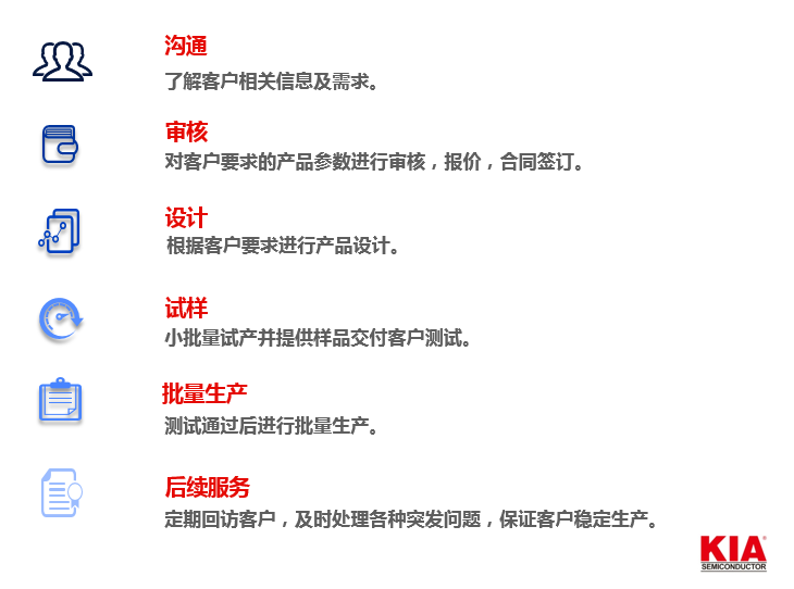 KIA半导体拥有从研发到制造封装,再到仓储和物流等一体化团队,让客户从一个想法变成成品,提高客户产品技术竞争力与性价比。