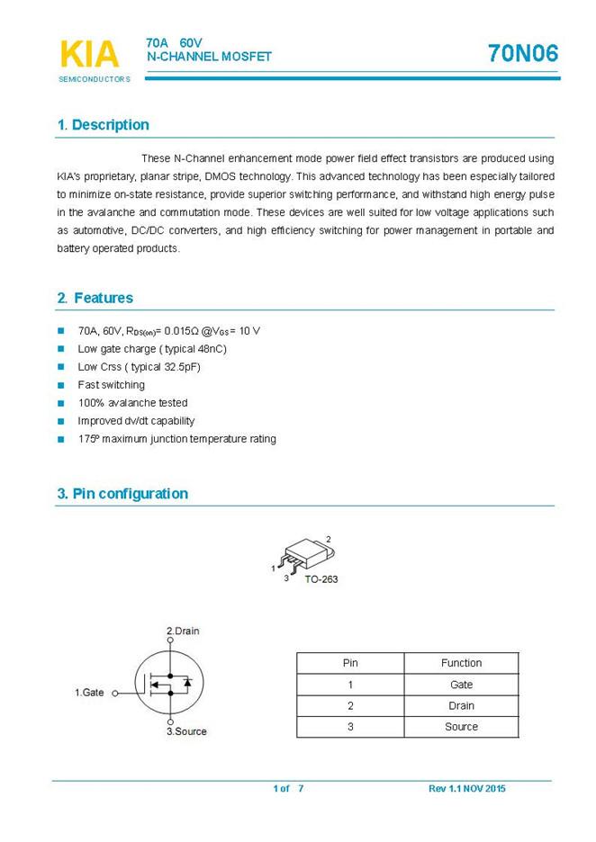 实亿国际参数: ID(A): 70 BVDSS(V): 60 RDS(ON): 0.015 Qg(nC): 40 Package: TO-263