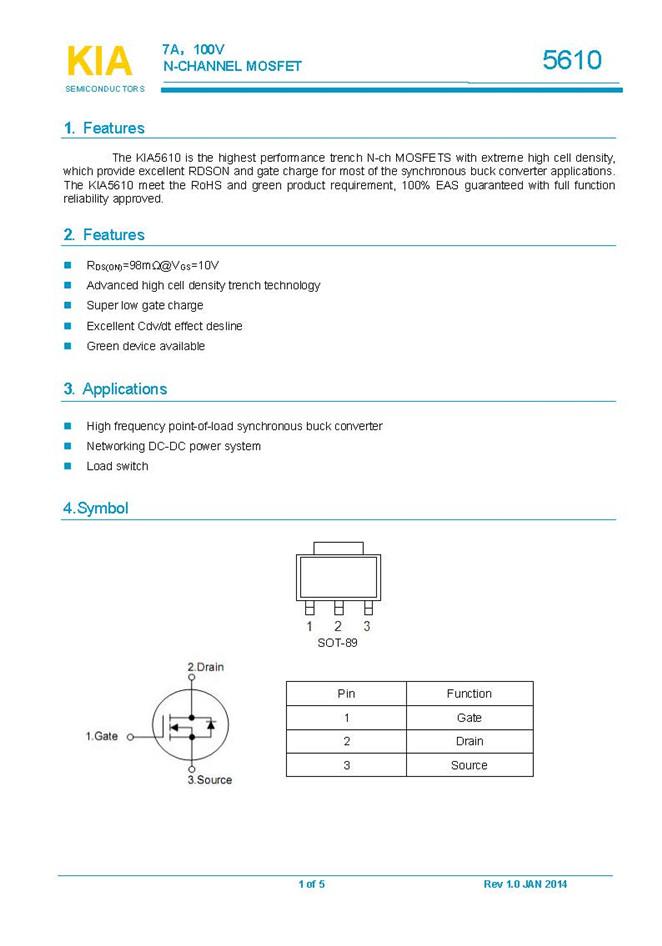 参数: ID(A): 7 BVDSS(V): 100 RDS(ON): 0.098 Qg(nC): 36.7 Package: TO-89