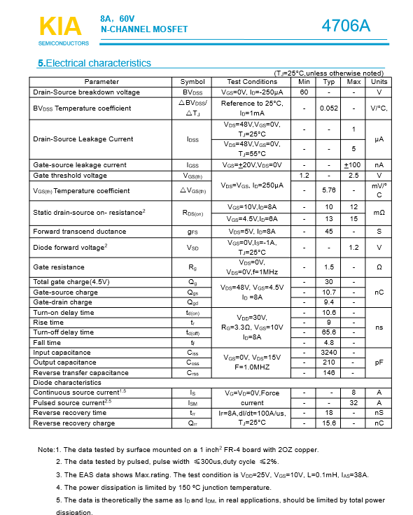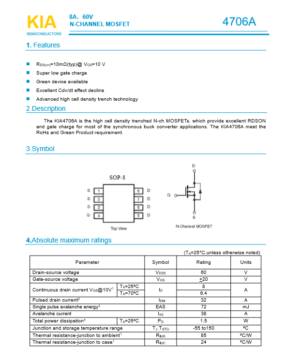 参数: ID(A): 8 BVDSS(V): 60 RDS(ON): 0.01 Qg(nC): 30 Package: sop-8
