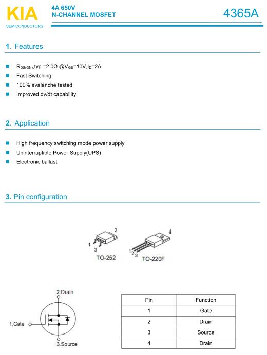 参数: ID(A): 4 BVDSS(V): 650 RDS(ON): 2.5 Qg(nC): 15.7 Package: TO-220F