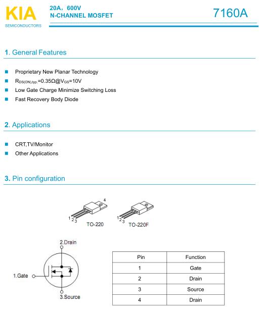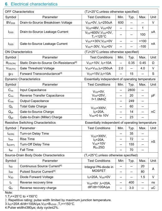 参数: ID(A): 20 BVDSS(V): 600 RDS(ON): 0.19 Package: TO-220F