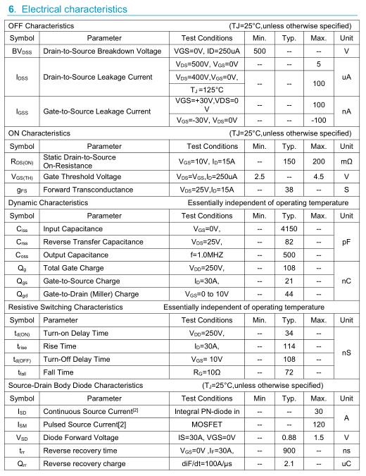 实亿国际参数: ID(A): 30 BVDSS(V): 500 RDS(ON): 0.2 Qg(nC): 108 Package: TO-3P