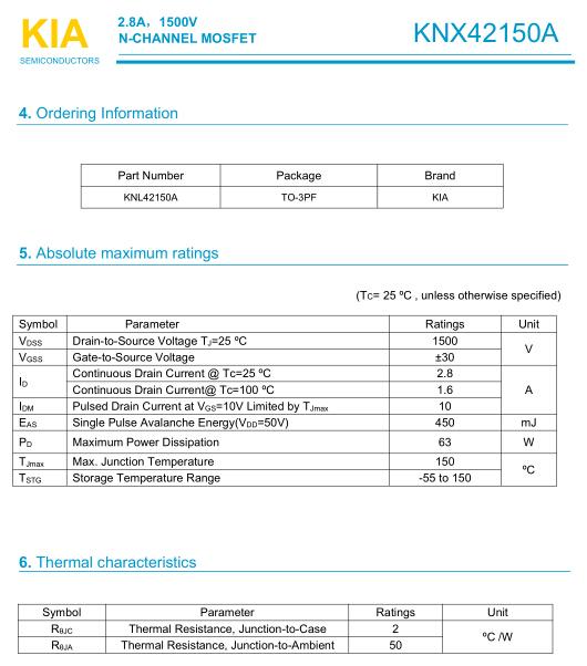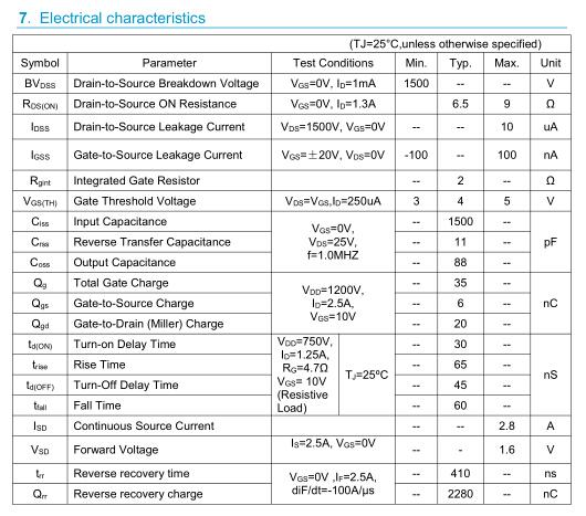 参数: ID(A): 2.8A    BVDSS(V): 1500V    RDS(ON): 6.5    Qg(nC): 35    Package: TO-3PF