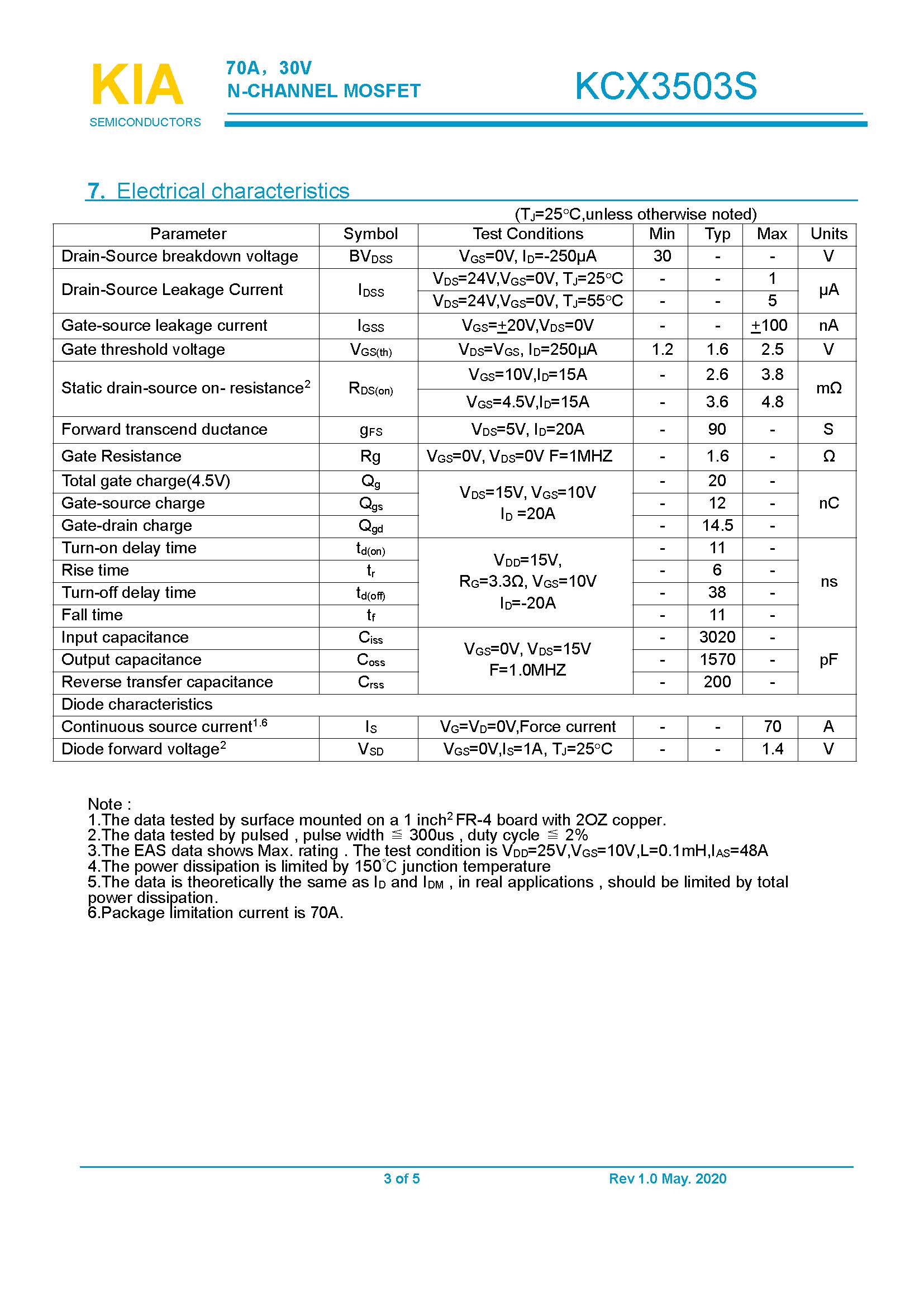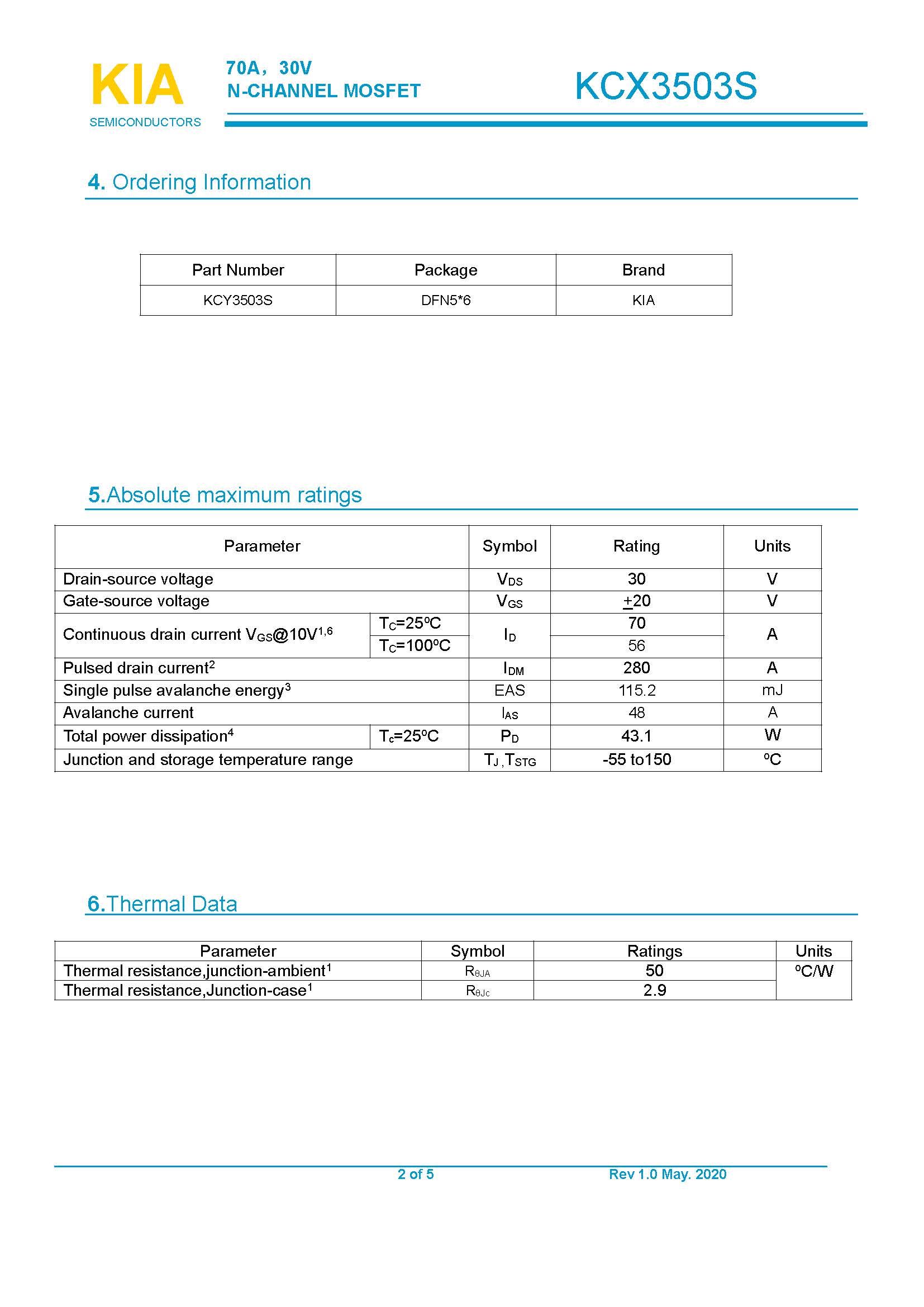 参数: ID(A): 70    BVDSS(V): 30    RDS(ON): 2.6    Qg(nC): 20    Package: DFN5*6
