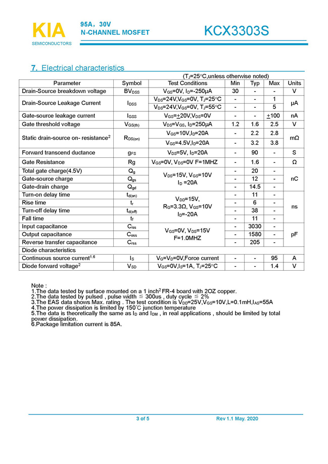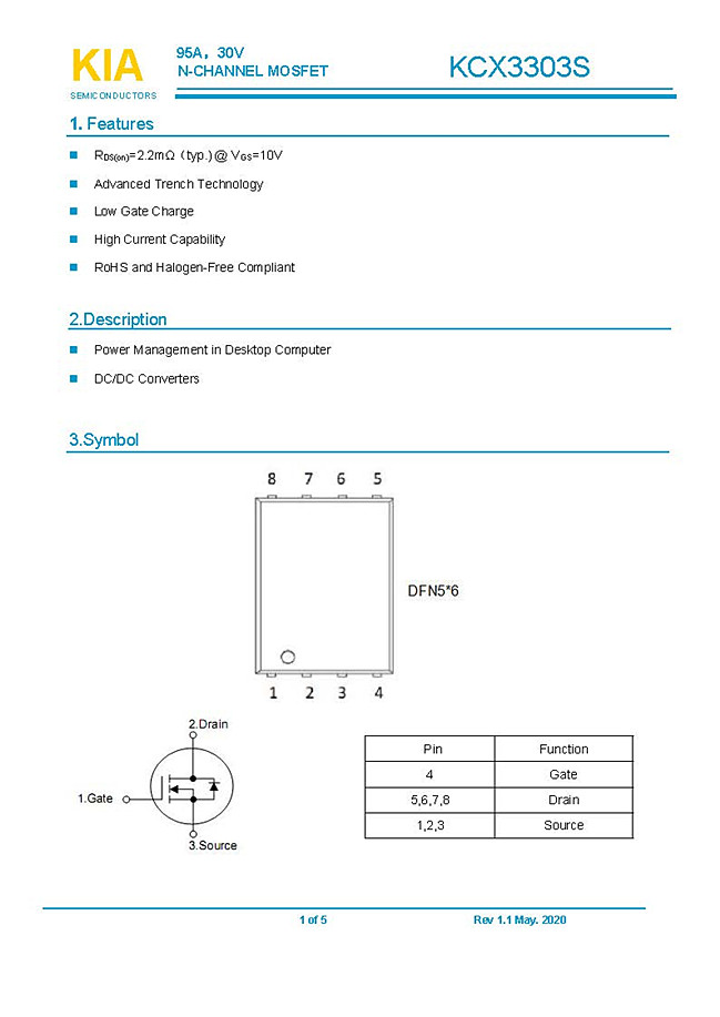 参数: ID(A): 95 BVDSS(V): 30 RDS(ON): 2.2 Qg(nC): 20 Package: DFN5*6