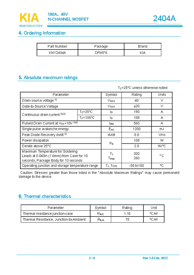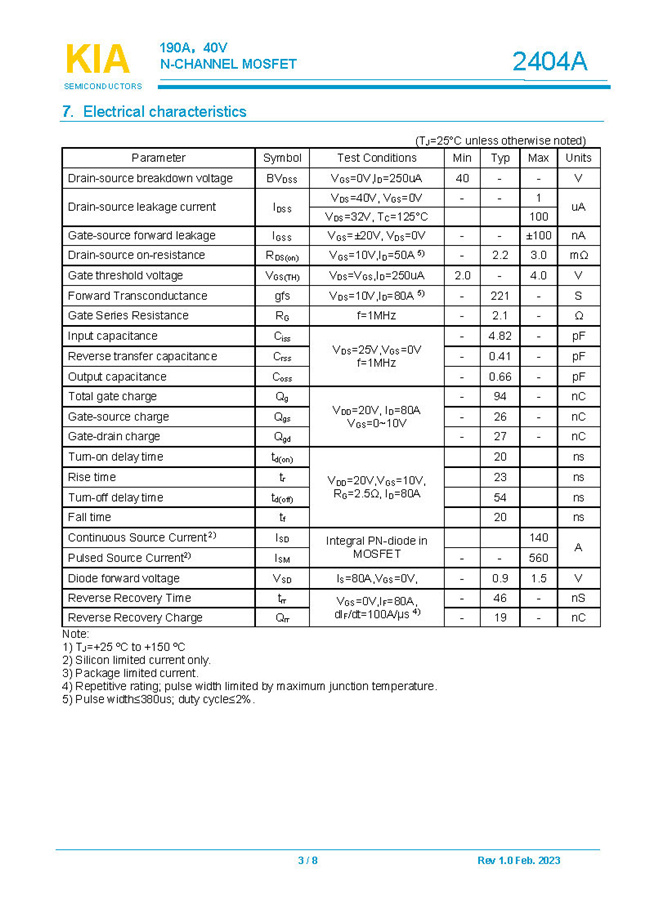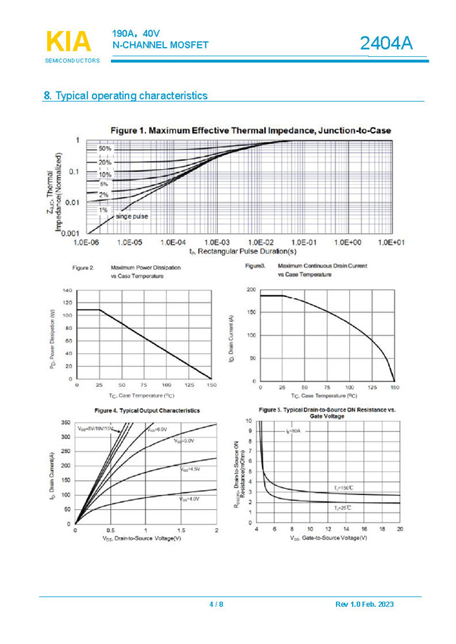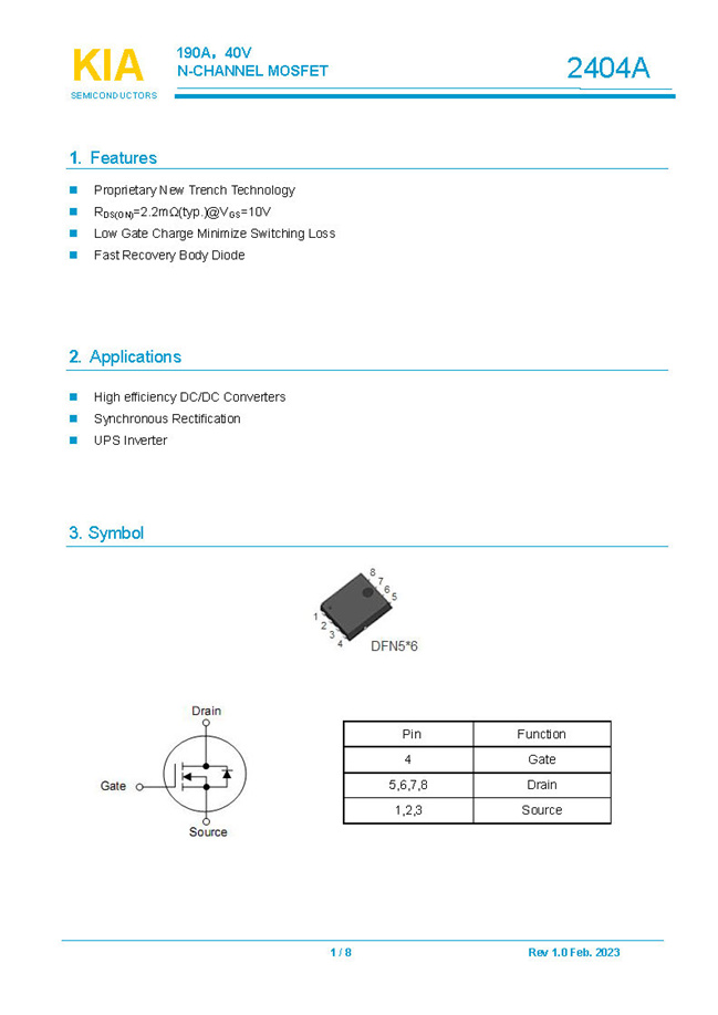参数: ID(A): 190 BVDSS(V): 40 RDS(ON): 2.2 Qg(nC): 94 Package: DFN5*6