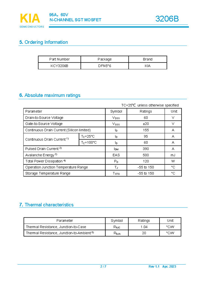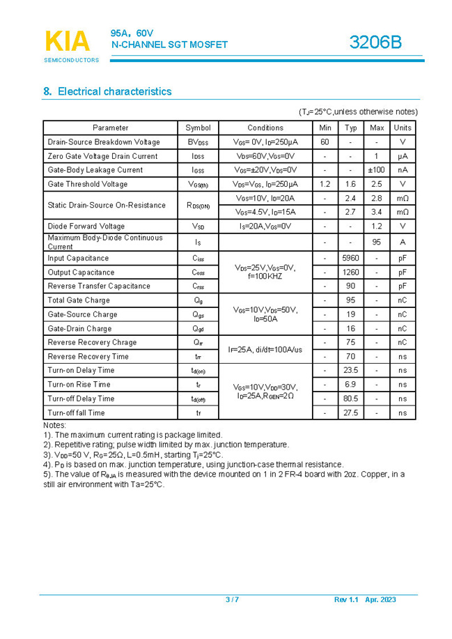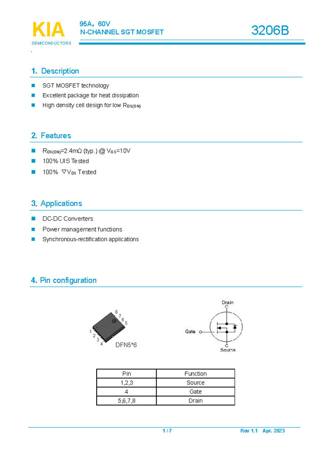 参数: ID(A): 95 BVDSS(V): 60 RDS(ON): 2.4mΩ Qg(nC): 95 Package: DFN5*6
