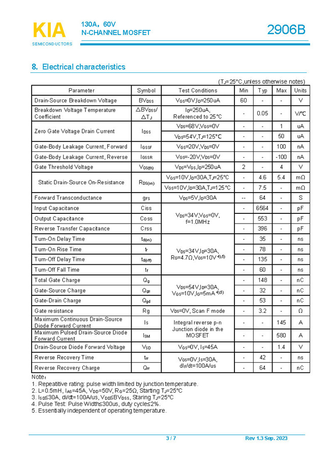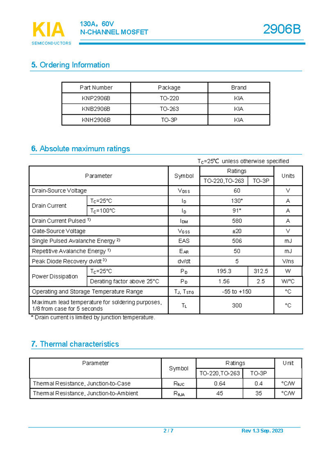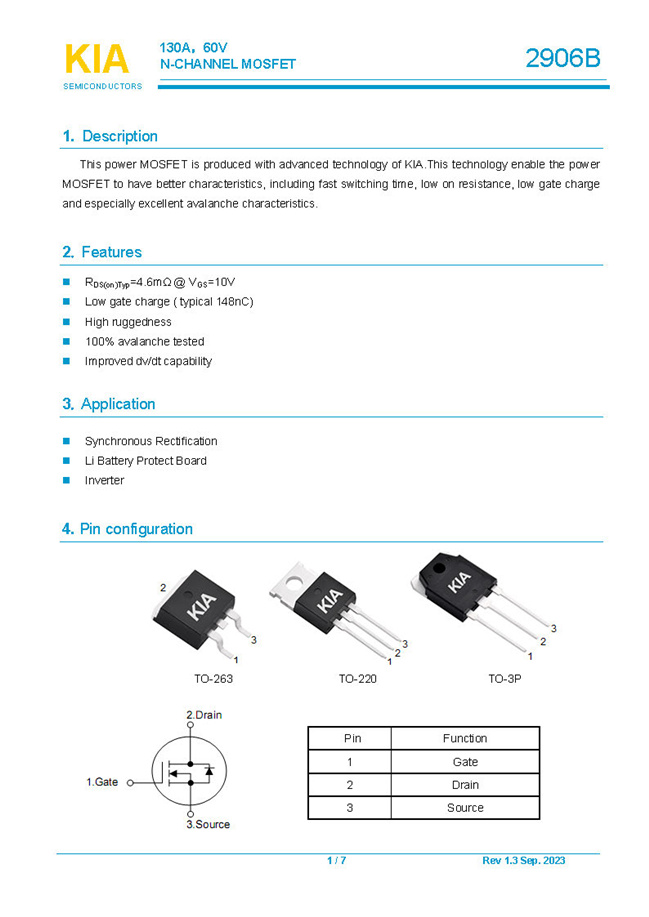 参数: ID(A): 130 BVDSS(V): 60 RDS(ON): 4.6mΩ Qg(nC): 148 Package: TO-220.TO-263.TO-3P
