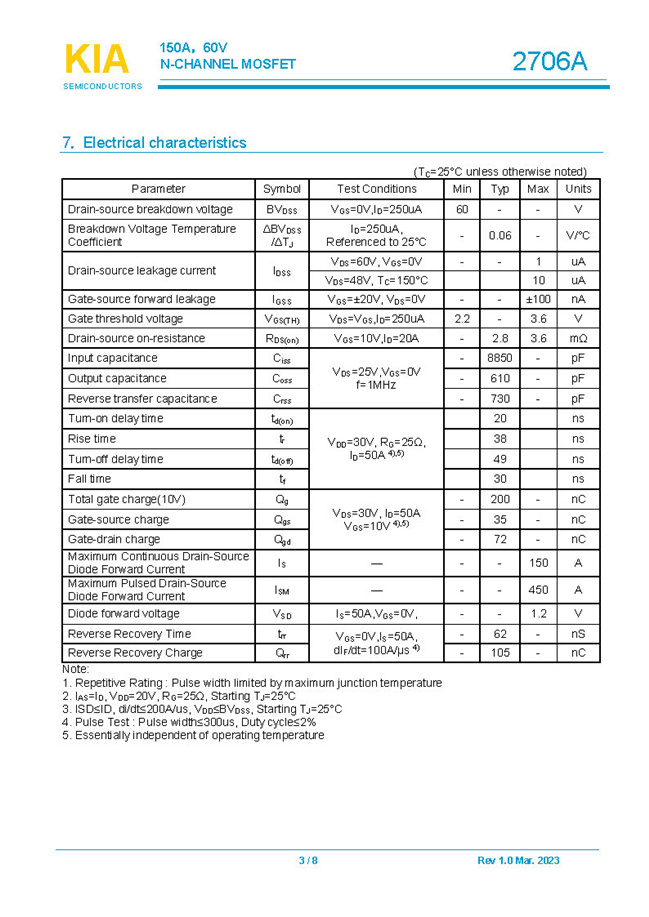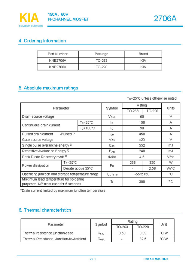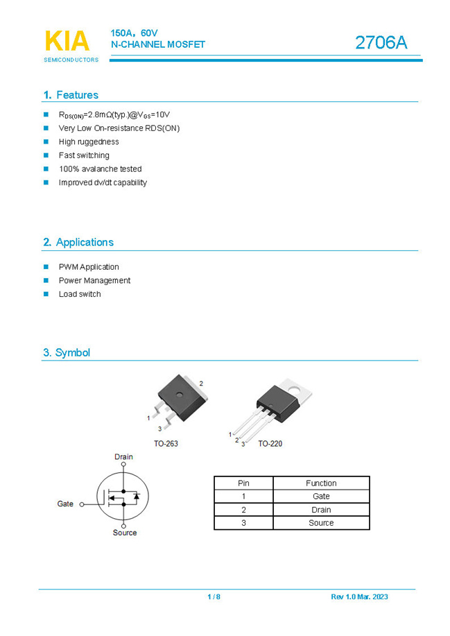 参数: ID(A): 150 BVDSS(V): 60 RDS(ON): 2.8mΩ Qg(nC): 200 Package: TO-220.TO-263