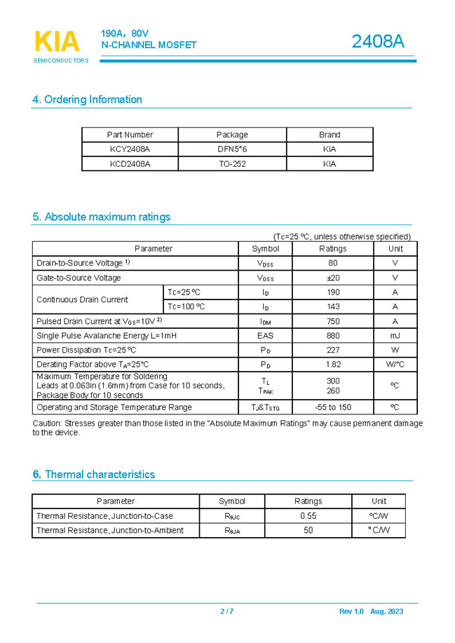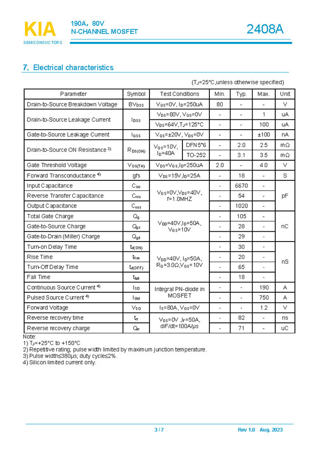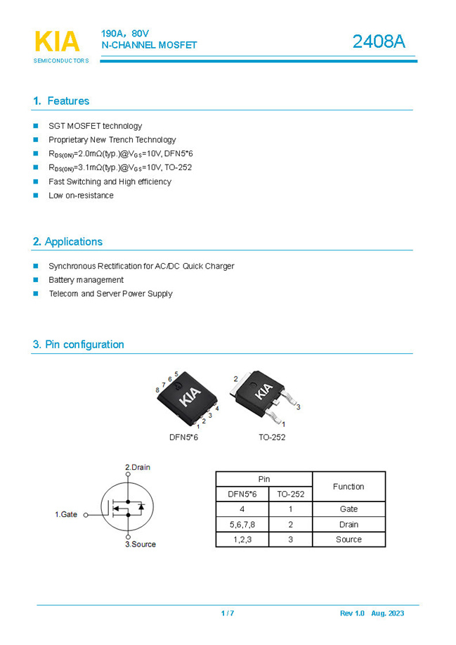 参数: ID(A): 190 BVDSS(V): 80 RDS(ON): 3mΩ Qg(nC): 105 Package: TO-252.DFN5*6