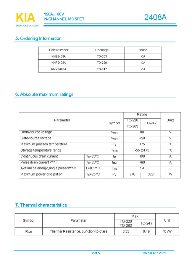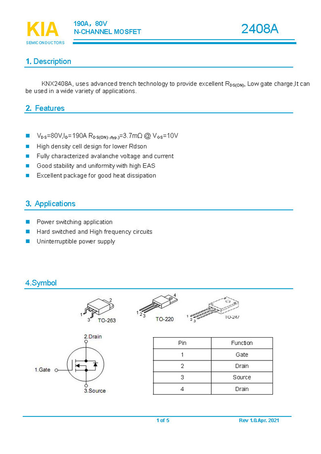 实亿国际参数: ID(A): 190 BVDSS(V): 80 RDS(ON): 3.7mΩ Qg(nC): 260 Package: TO-220.TO-263.TO-247