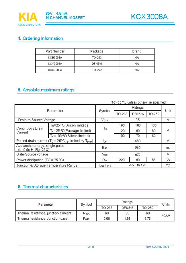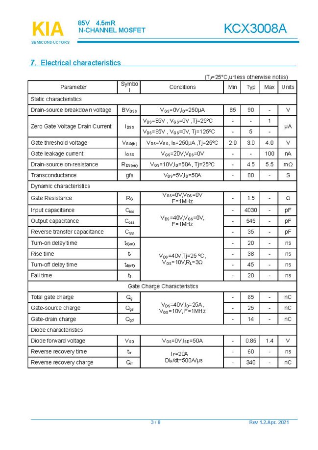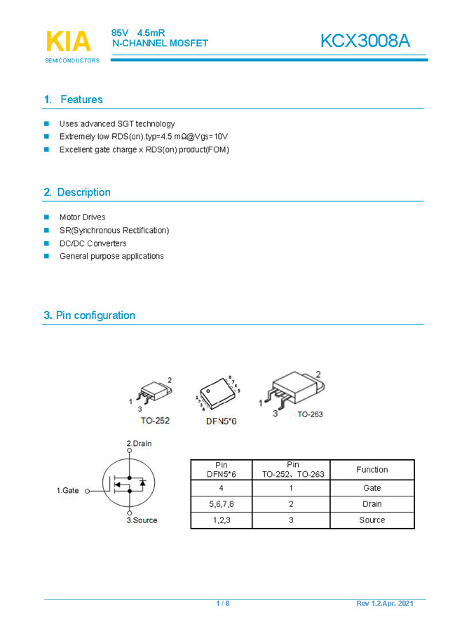 实亿国际参数: ID(A): 120 BVDSS(V): 85 RDS(ON): 4.5mΩ Qg(nC): 65 Package: TO-252.TO-263.DFN5*6