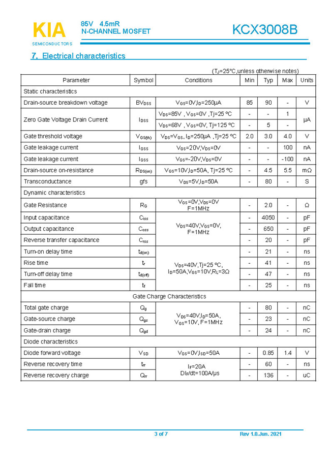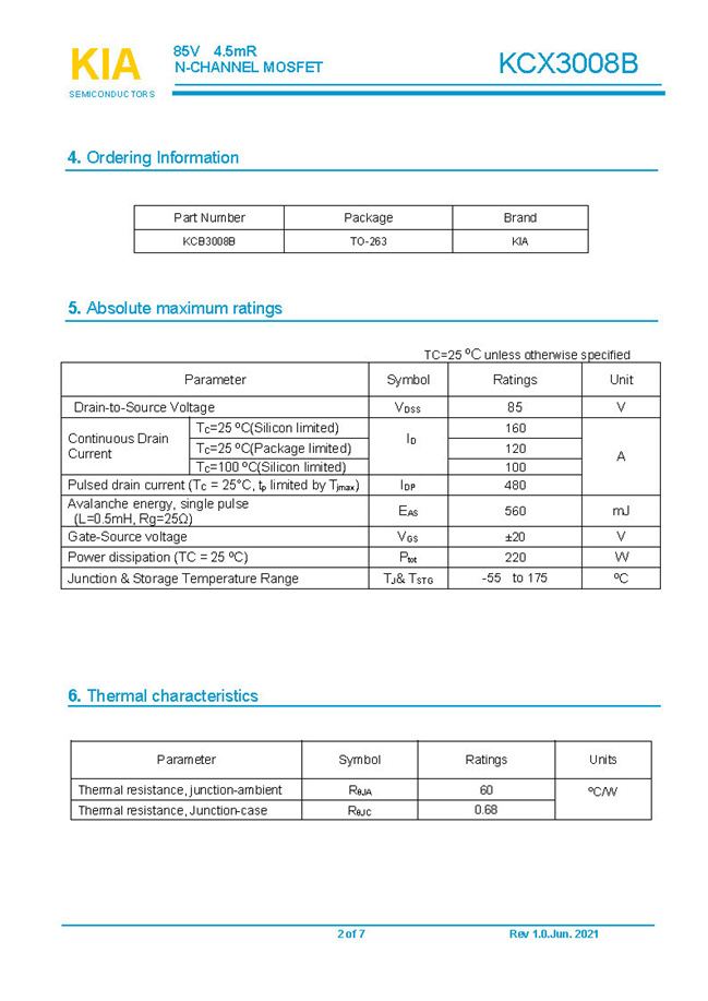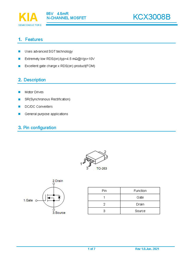 参数: ID(A): 160 BVDSS(V): 85 RDS(ON): 4.5mΩ Qg(nC): 80 Package: TO-263