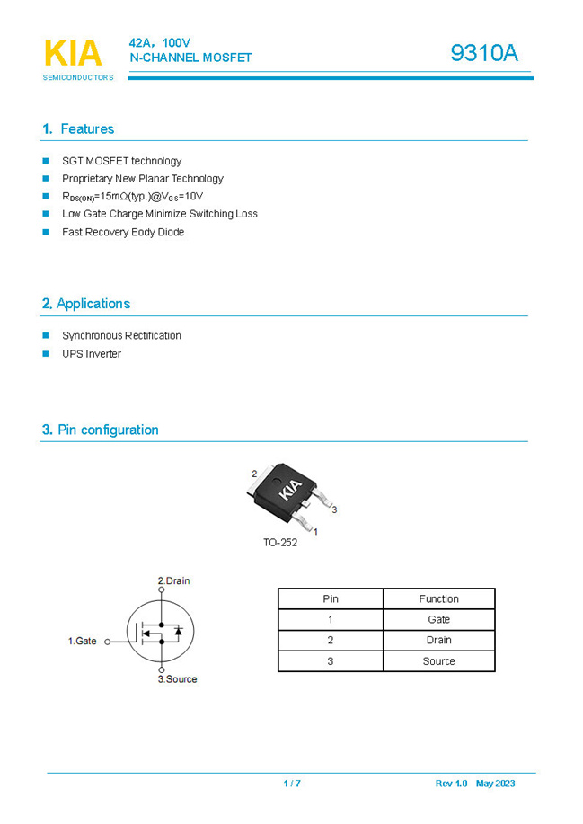 实亿国际参数: ID(A): 42 BVDSS(V): 100 RDS(ON): 15mΩ Qg(nC): 20 Package: TO-252