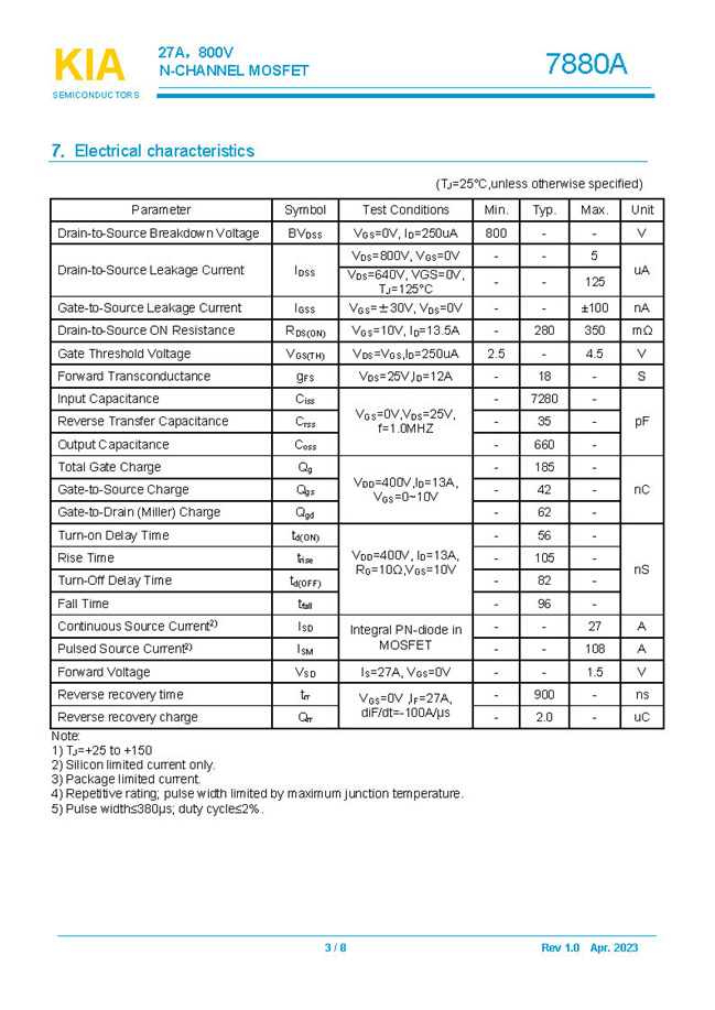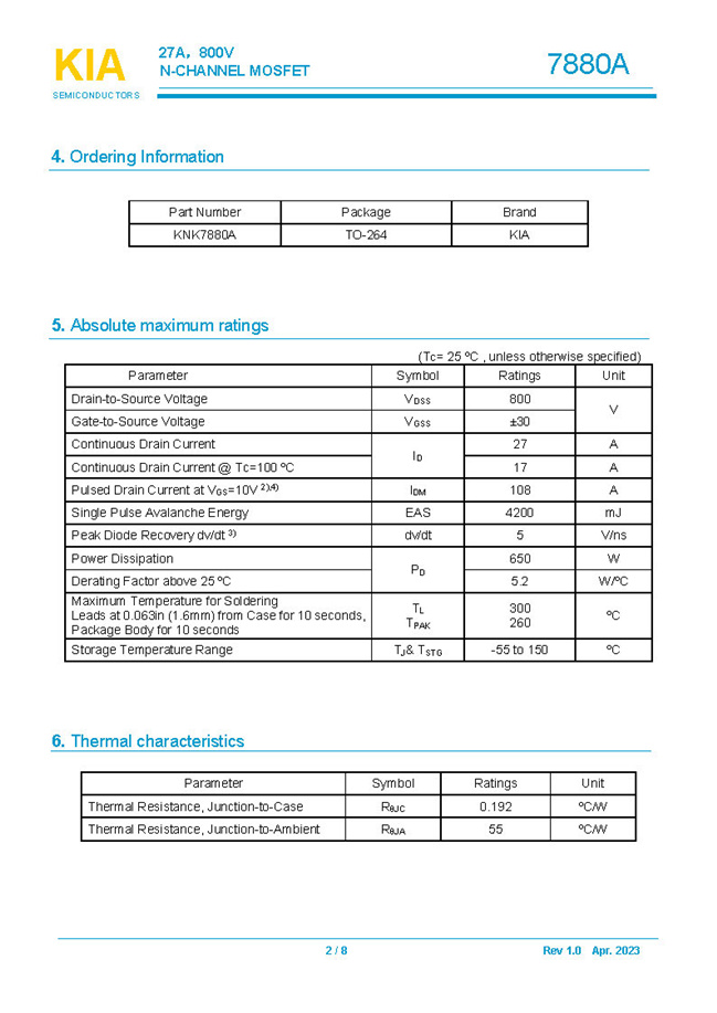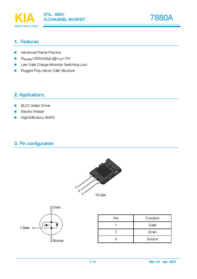 参数: ID(A): 27 BVDSS(V): 800 RDS(ON): 280mΩ Qg(nC): 185 Package: TO-264