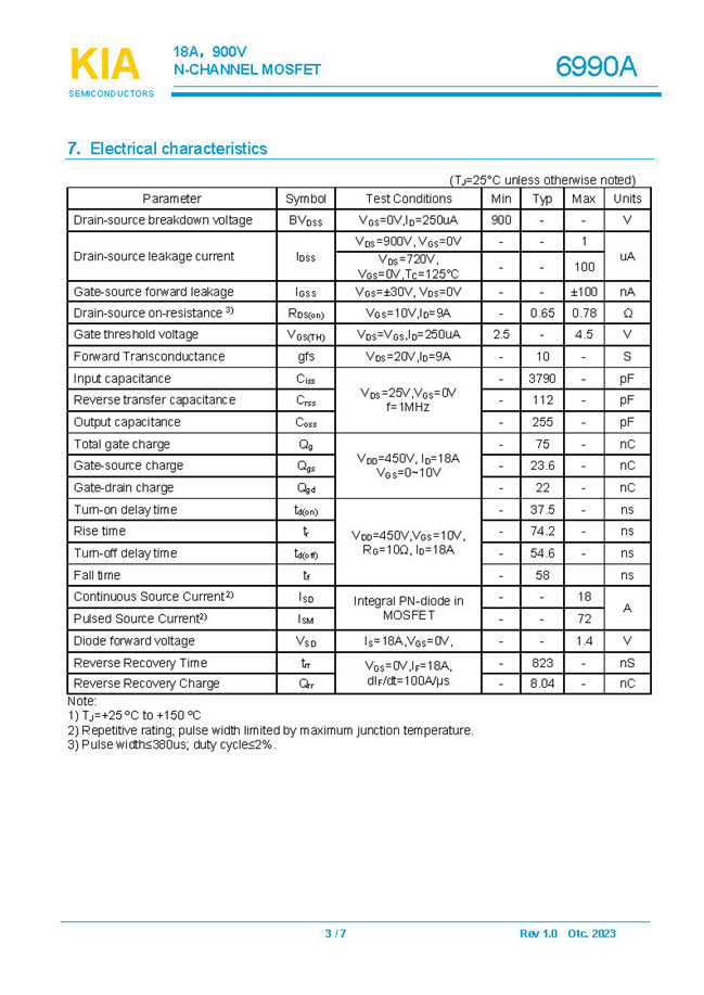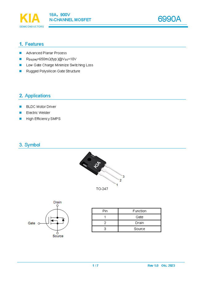 参数: ID(A): 18 BVDSS(V): 900 RDS(ON): 650mΩ Qg(nC): 75 Package: TO-247