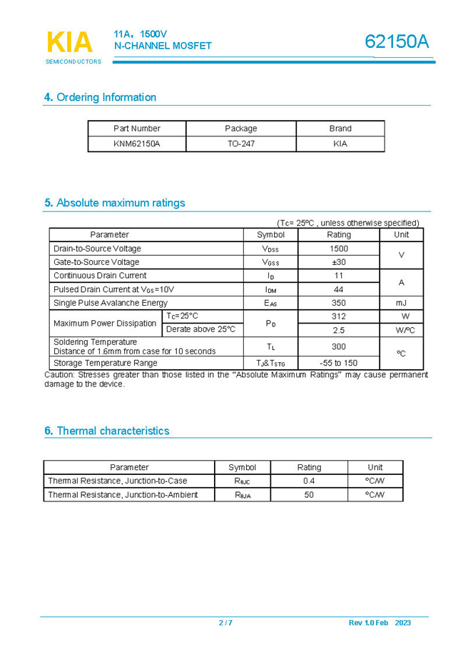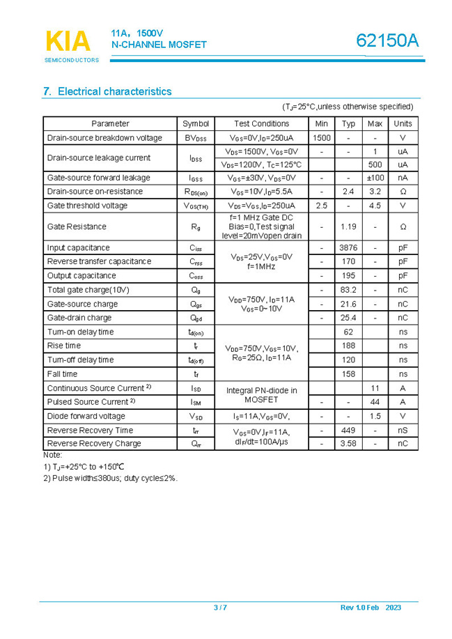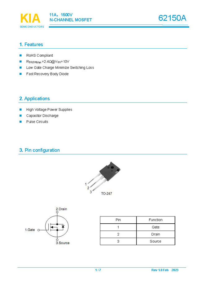 参数: ID(A): 11 BVDSS(V): 1500 RDS(ON): 2.4Ω Qg(nC): 83.2 Package: TO-247