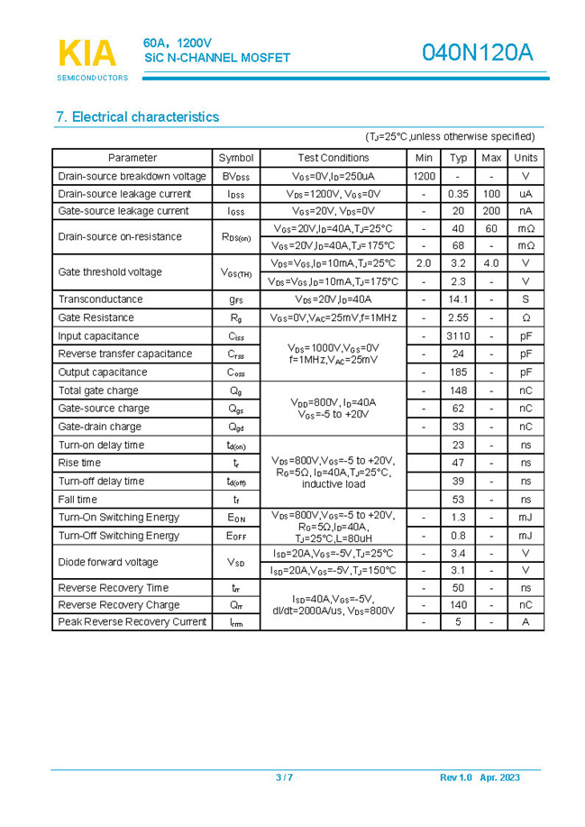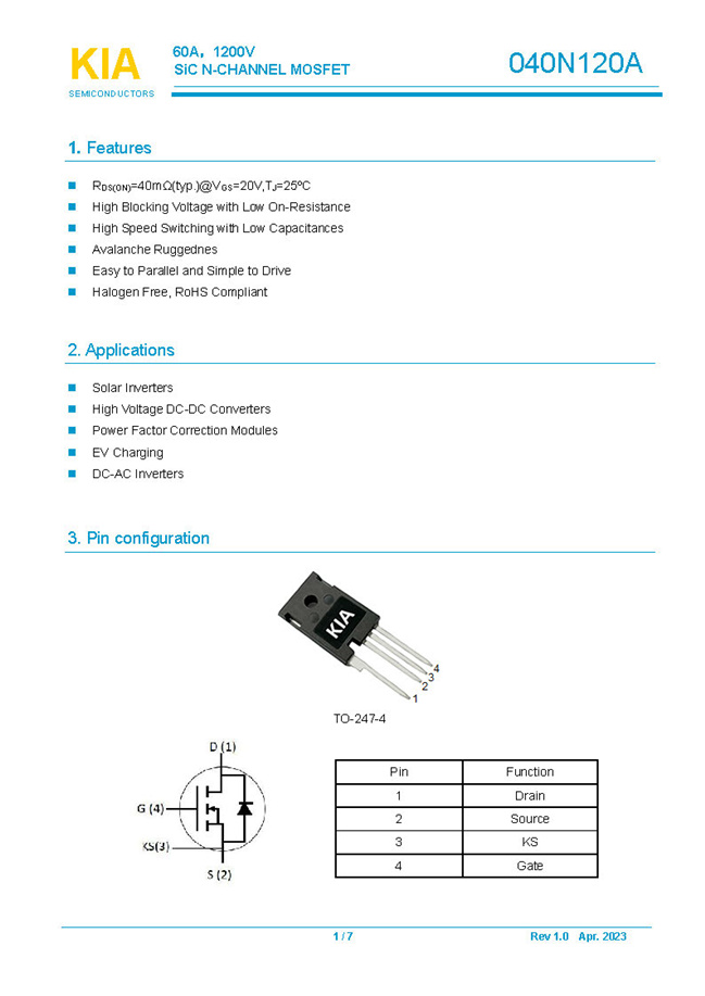 实亿国际参数: ID(A): 60 BVDSS(V): 1200 RDS(ON): 40mΩ Qg(nC): 148 Package: TO-247-4